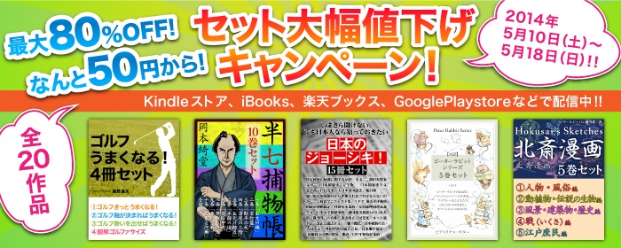 ゴマブックス株式会社(所在地:東京都港区、代表取締役社長:赤井仁)は、Kindleストア、楽天Kobo電子書籍ストア、Google Play、iBooksなどで配信中の電子書籍セットシリーズを、2014年5月10日(土)~5月18日(日)の期間限定で、最大80%値下げするキャンペーンを実施いたします。