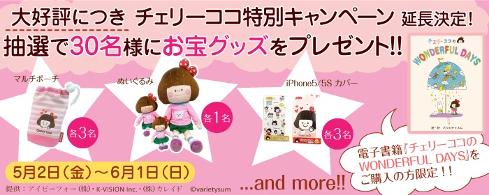 また2014年5月2日(金)より、電子書籍『チェリーココのWONDERFUL DAYS』をご購入いただいた方を対象に、LINEスタンプでおなじみのキャラクター「チェリーココ」関連グッズが抽選で30名様に当たるキャンペーンを実施していますが、こちらのキャンペーン期間を2014年6月1日(日)まで延長することを発表します。